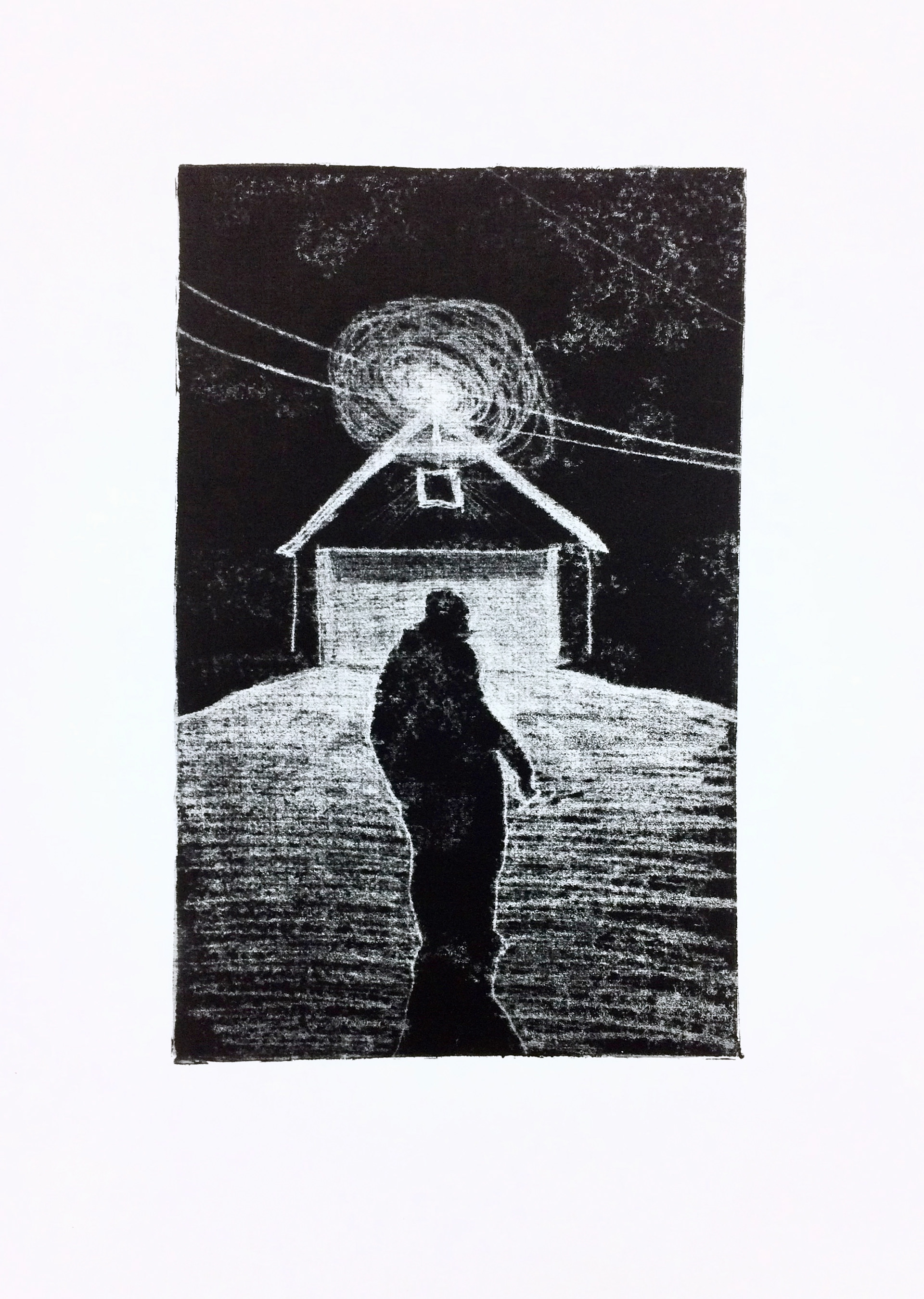 A negative-positive monoprint of my brother in the Adirondacks at night.