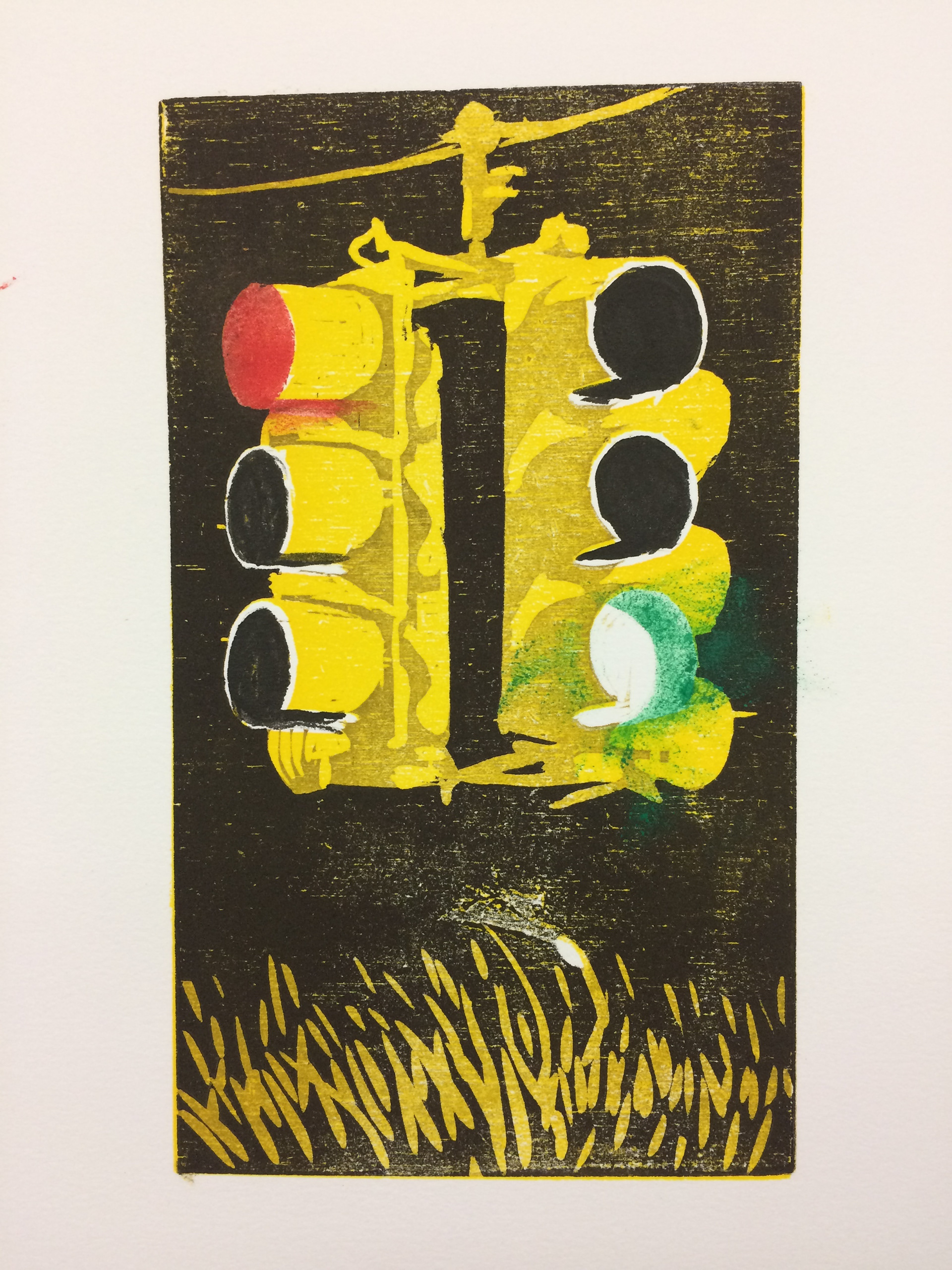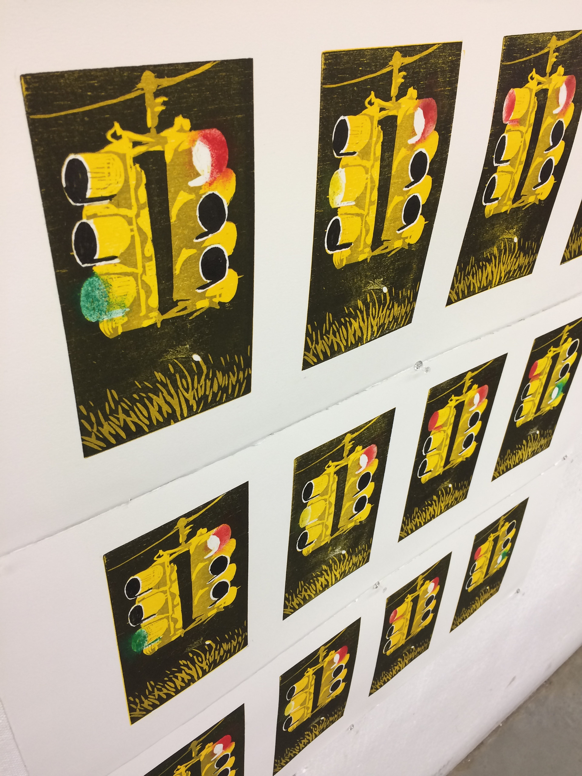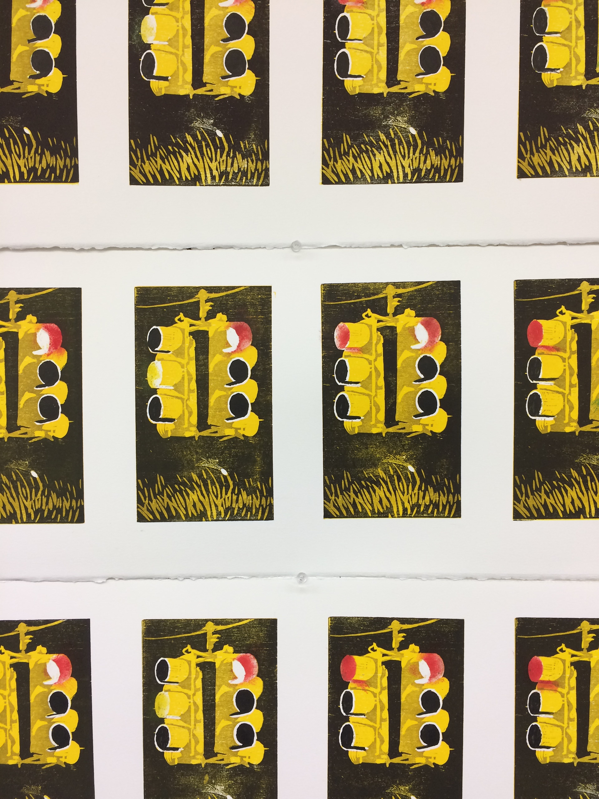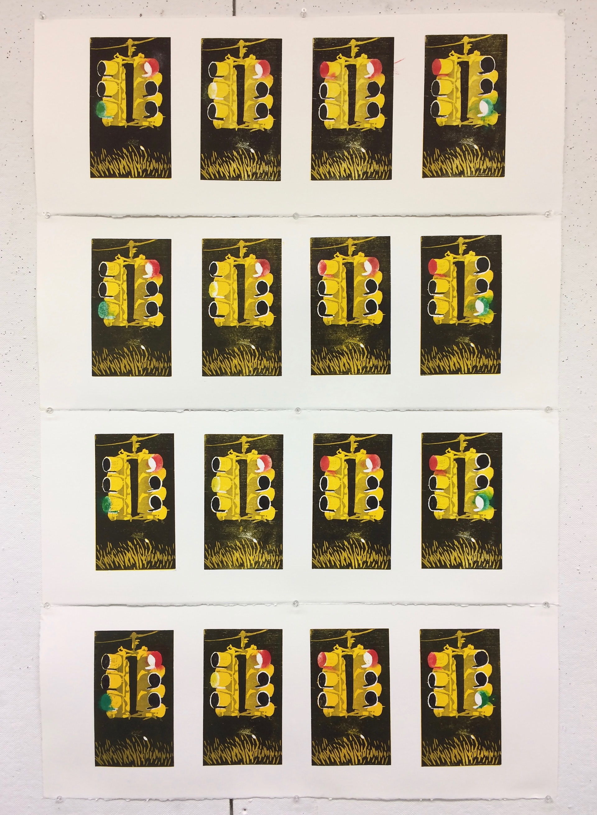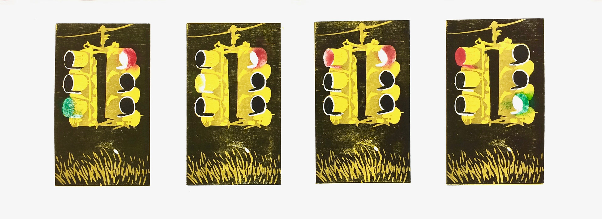 A series of four-panel woodblock prints, depicting the cycle of a traffic light from red to green.
