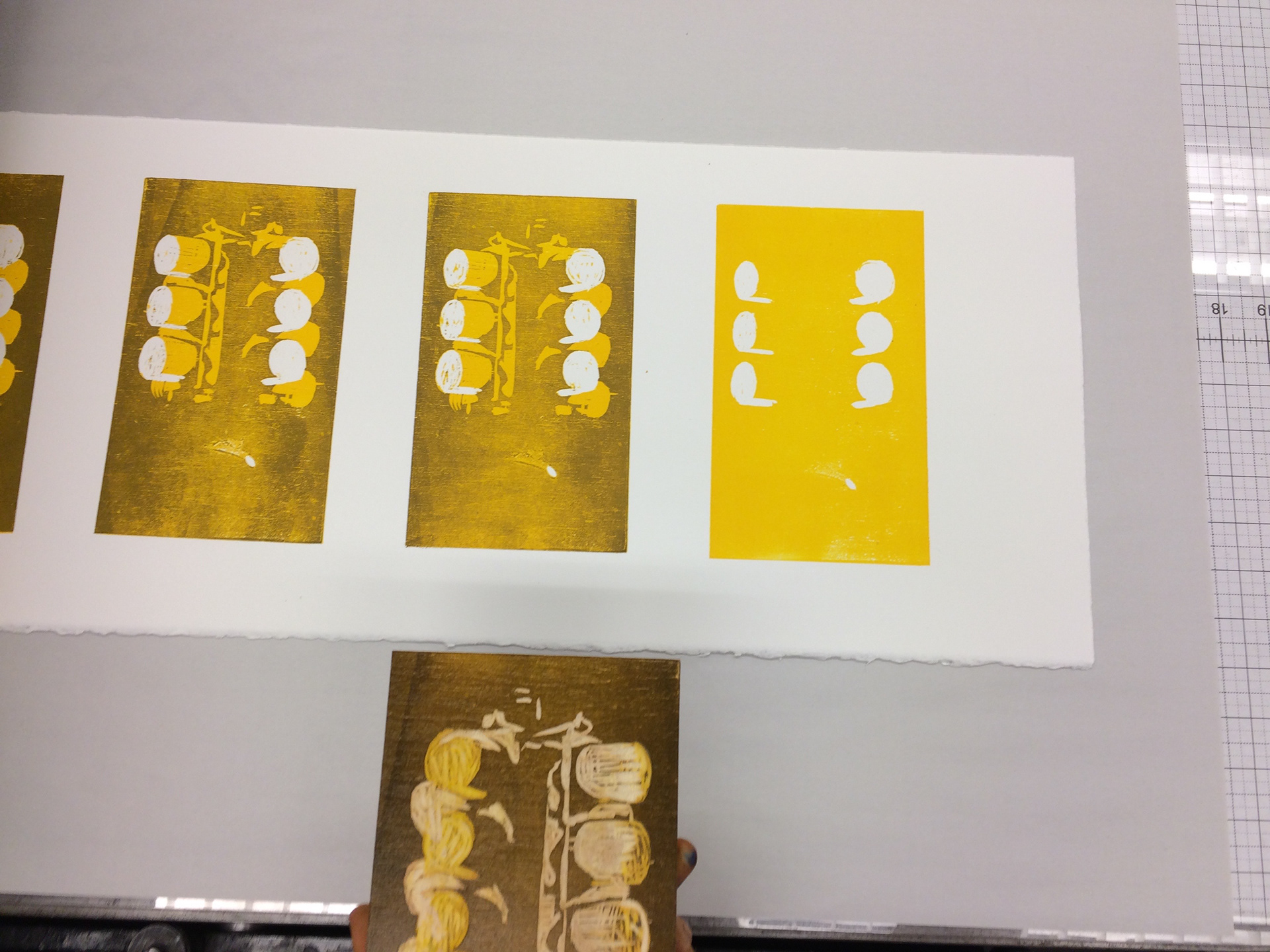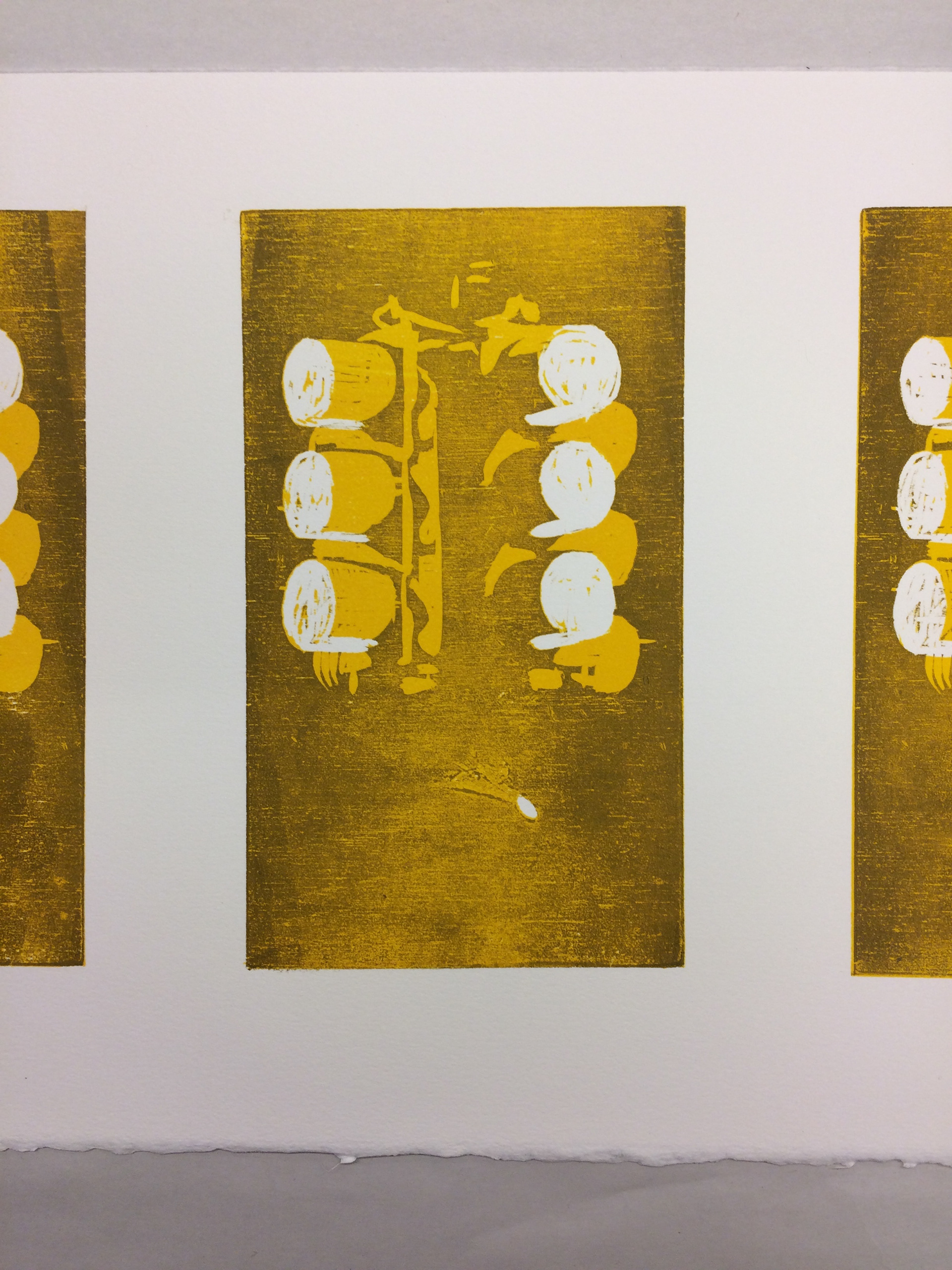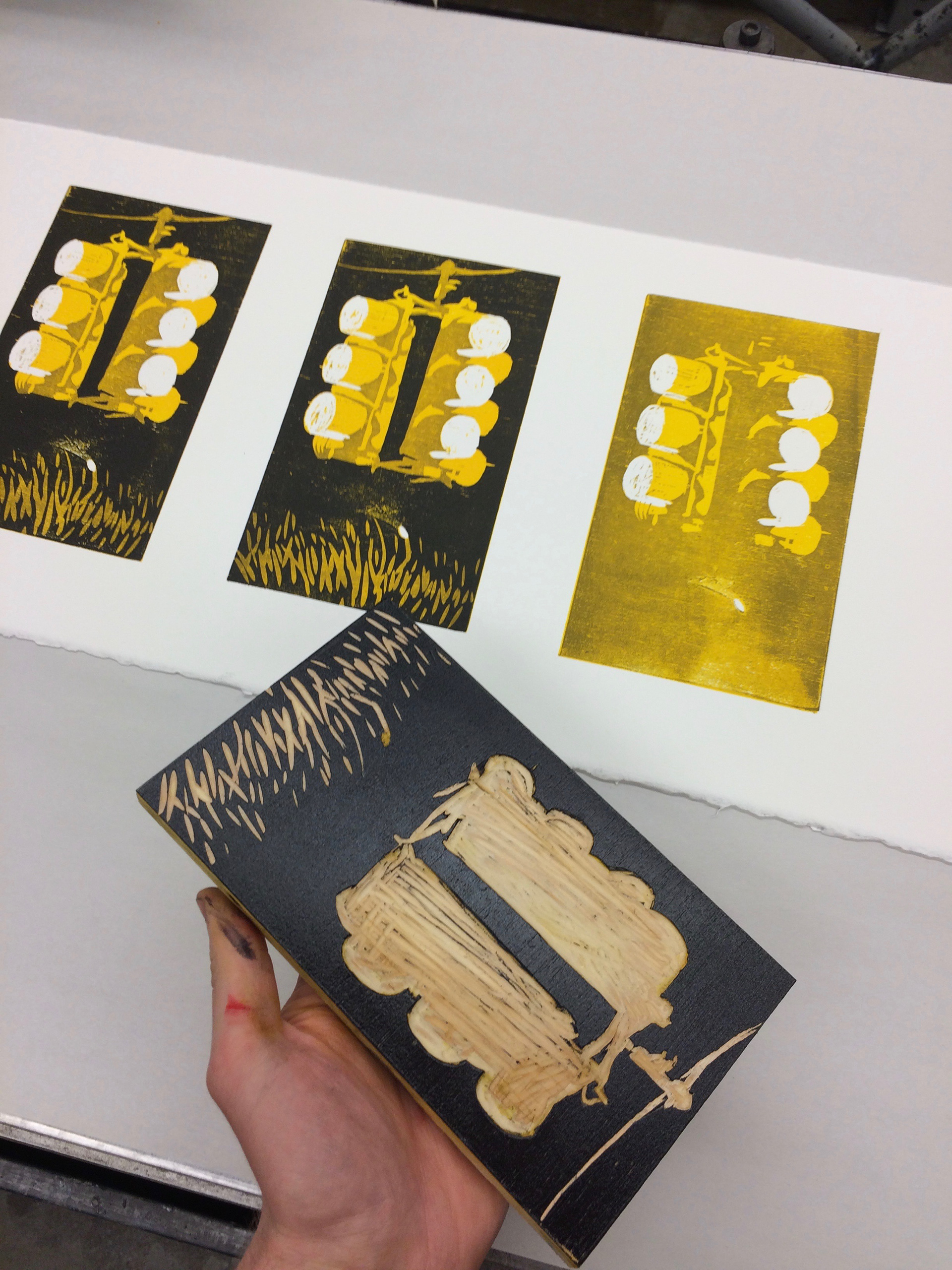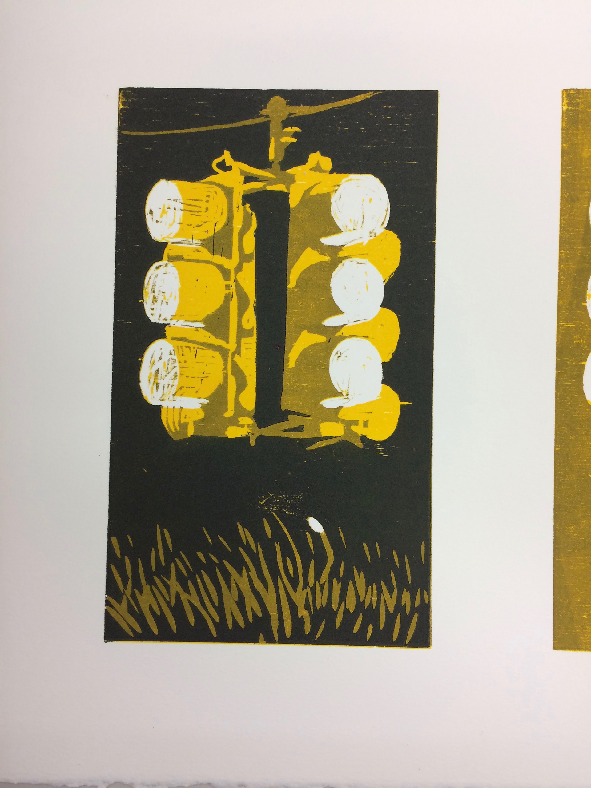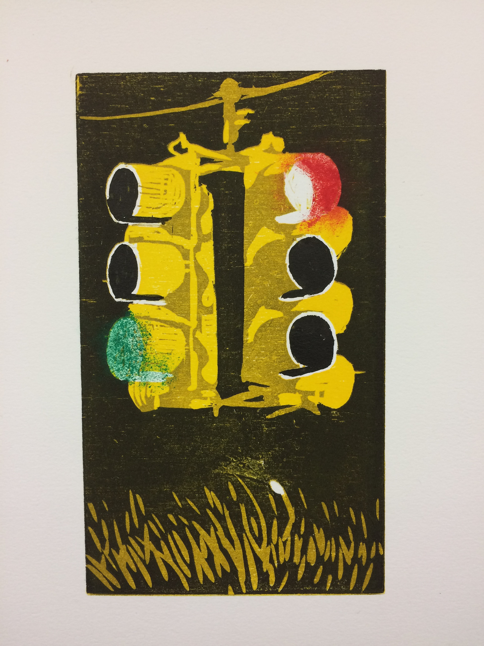A series of four-panel woodblock prints, depicting the cycle of a traffic light from red to green.